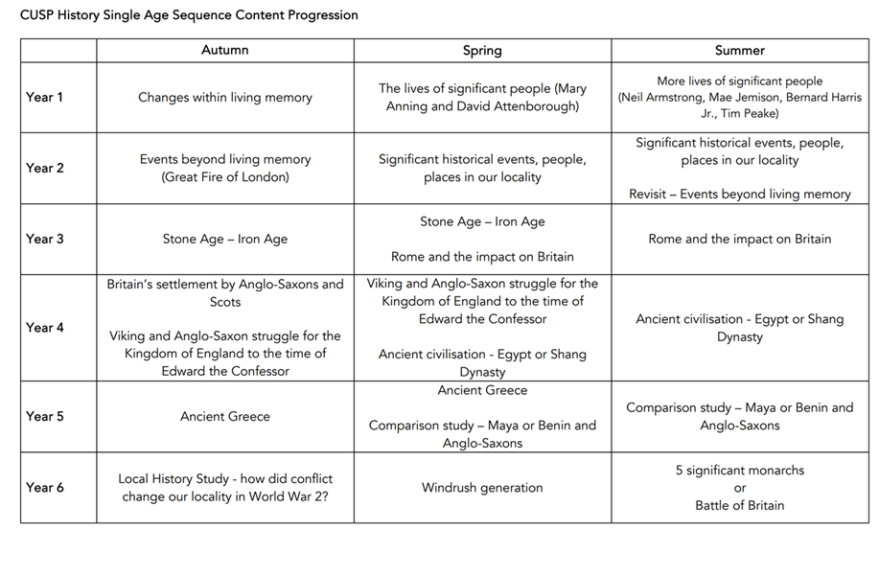 The CUSP History curriculum covers a broad and ambitious range of historical periods, events, and individuals from EYFS to Year 6.