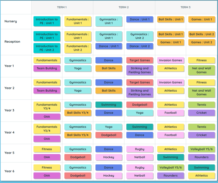 Our curriculum is carefully sequenced to ensure progression in physical skills, knowledge, and understanding. Units build on prior learning, with clear links across year groups and key stages. Fundamental movement skills are introduced early and revisited in increasingly complex contexts. For example, throwing and catching may begin in KS1 and evolve into strategic gameplay in KS2. Seasonal sequencing supports practical delivery, with outdoor units placed in warmer terms. This structured progression ensures pupils develop competence and confidence over time, with opportunities to consolidate and extend learning through extracurricular sport and inter-school competition.